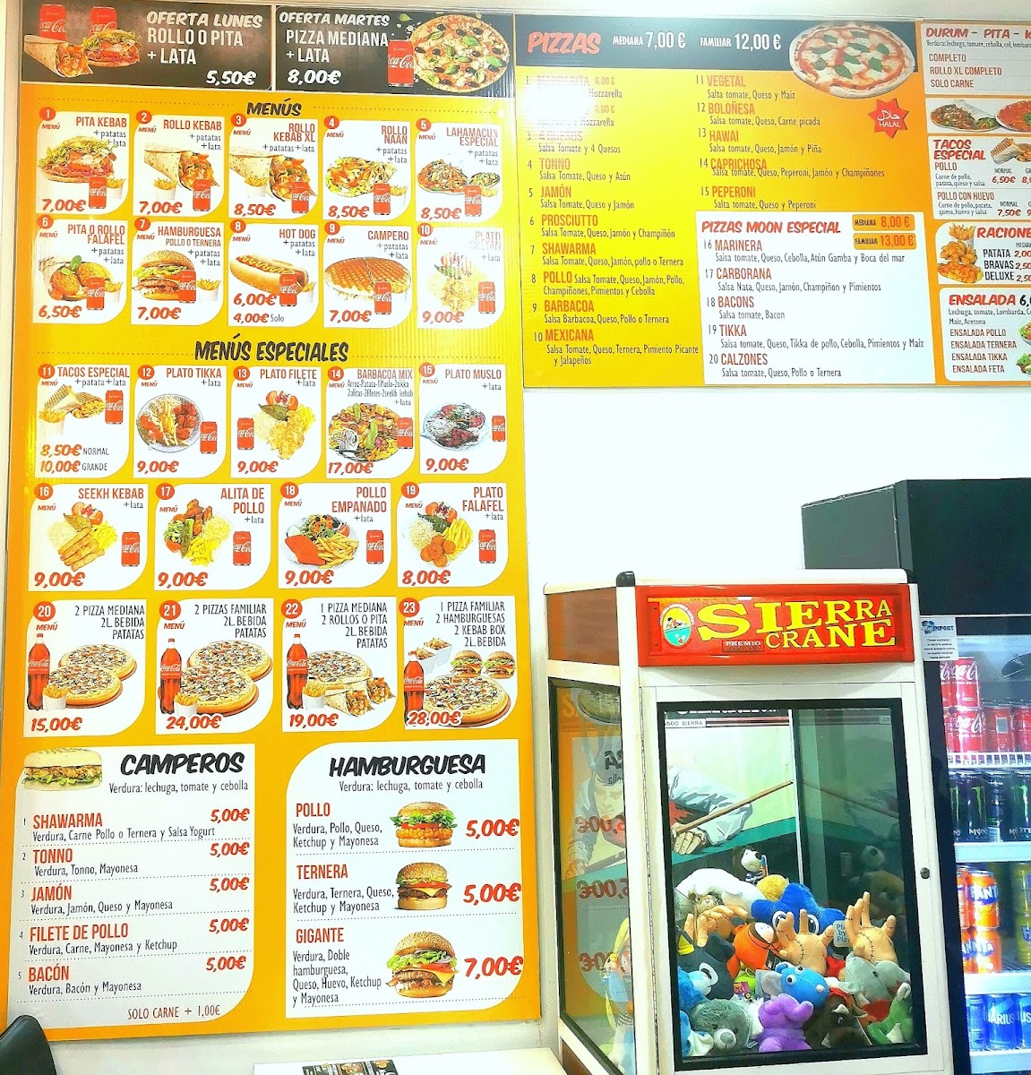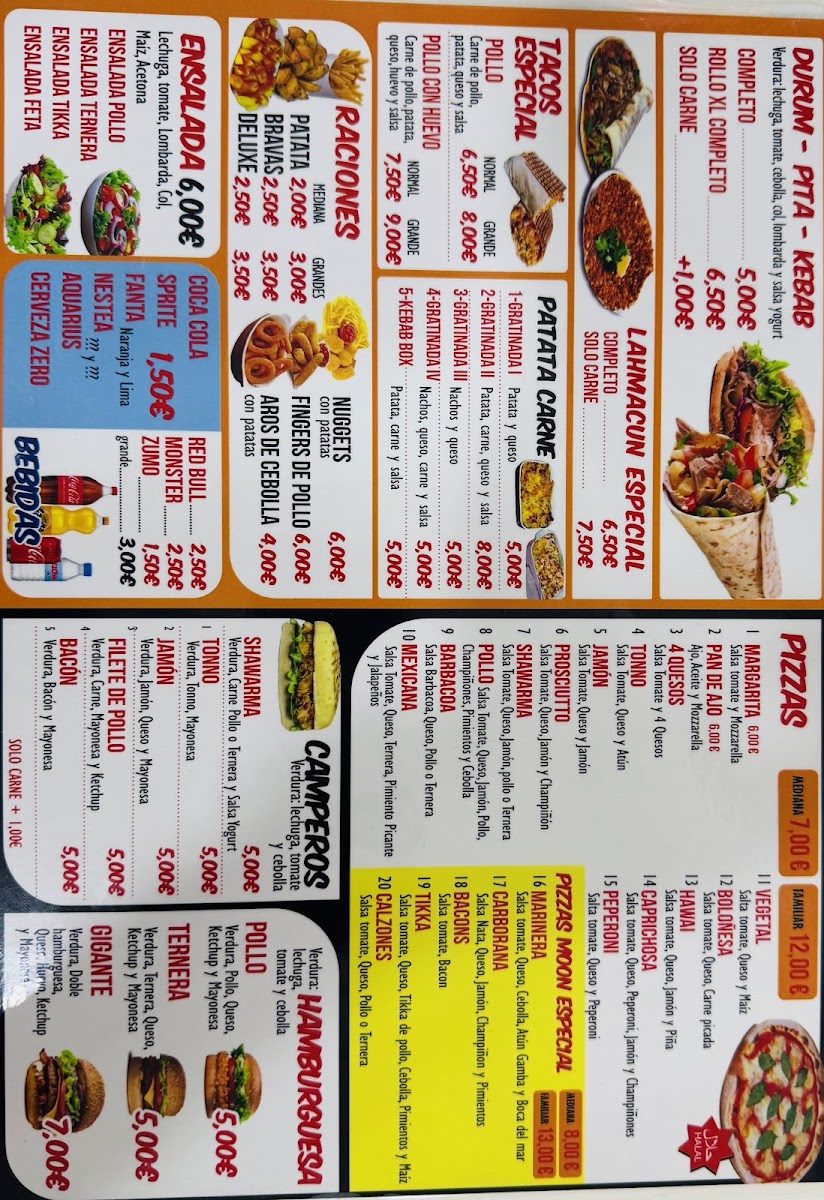 The menu at Moon Kebab offers a variety of halal food options centered around doner kebabs and accompaniments. It is organized into several main categories including beverages, gratinated potatoes, and portions (raciones), allowing for easy selection based on appetite and preference.